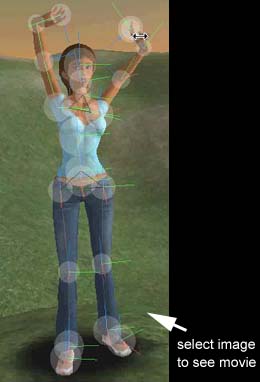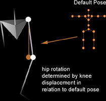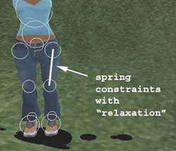If you don't think it's important to apply human-like constraints on these joints, try bending an elbow backwards, or pulling the head back 120 degrees. The pain endured from just watching your avatar become twisted-sister is enough to convince anyone of the importance of applying limits on how these joints can move in relation to each other. But since the simulation uses balls and springs, with no explicit rotations to the bones, it is not easy to simply say, "don't allow the knee rotation to go less than zero". |