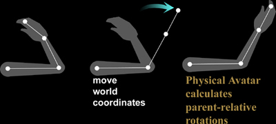 Avatar Puppeteering introduces a completely physics-based means of naturalistically animating the avatar, in which every joint can be pushed, pulled, or rotated in real time for maximum expressivity and responsiveness. The underlying technology for Puppeteering is called "Physical Avatar" - it is called that because it uses forward dynamics to affect the positions of avatar body parts in the virtual world. Think of it as Ragdoll Physics without gravity. This is explained in the sections below. |