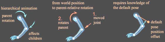 Physical Avatar requires several layers of joint representation, including the joint's world-coordinate position, its world-coordinate rotation, its parent-relative position, and its parent-relative rotation. It also uses other attributes which are specific to the algorithm, and not very interesting in this context. The most important point is that joints use world-coordinate positions, and this is necessary for physical simulation, as described below. |