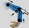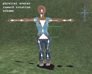 This is basic hierarchical modeling. You could say that the information flows from the pelvis outward to all the joints. Now, I would like to propose that the Physical Avatar system does just the opposite. The information flow goes inward instead of outward. In this sense it is more like inverse kinematics. In hierarchical modeling, the rotation of the elbow determines the position of the wrist. But in the Physical Avatar, the position of the wrist determines the rotation of the elbow (plus a few other things for reference, as explained below). |