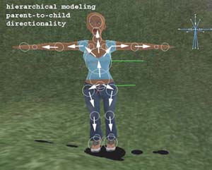 We often refer to this node in the hierarchy as the "root". The root is the "parent" of the pelvis joint, which is itself the parent of all the rest of the skeletal joints. In hierarchical modeling, we refer to "parent-child" relationships among objects.