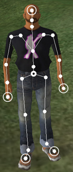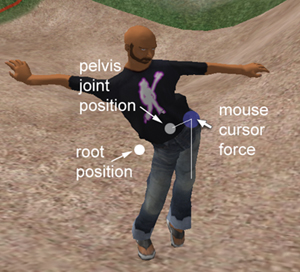Physical Representation As mentioned above, puppeteering starts when the user hovers the mouse cursor over a joint, presses CONTROL, and clicks the mouse button. This initializes the Physical Avatar engine. At initialization, an array of 24 world-coordinate positions is generated. Starting with the root position and rotation, the hierarchy of parent-relative joint rotations is recursively traversed to calculate the world-coordinate positions. These become the joints of the Physical Avatar skeleton. The default pose array and the parent-relative rotations of each joint are also stored when Physical Avatar is initialized. The world-coordinate positions are used as the locations for a collection of physically-simulated balls floating in space, which correspond to the joints of the avatar at the time of initialization. Each ball is constrained to its neighbors by way of spring forces . "Neighbor" is defined here as the joint's parent and its children, if any. |