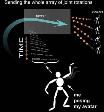 The Root The position and rotation of a character in a virtual world is typically stored both on a server as well as all the clients (viewers) of users who have the avatar within view. The positions and rotations of other avatars and objects are also represented this way. Most of these objects have associated polygonal models. In Second Life, some of these models (and all the avatars) have physics simulated using Havok. In the case of avatar, this model is actually a simplified shape, which is invisible, and used only for detecting collisions. When a user controls his/her avatar by walking around or flying, the changes in position and rotation are sent up to the server, so it can update accordingly, and pass this updated information back down to all the viewers. |