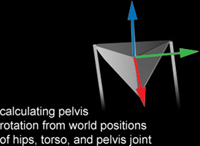 This is basic hierarchical modeling. You could say that the information flows from the pelvis outward to all the joints. Now, I would like to propose that the Physical Avatar system does just the opposite. The information flow goes inward instead of outward. In this sense it is more like inverse kinematics. In hierarchical modeling, the rotation of the elbow determines the position of the wrist. But in the Physical Avatar, the position of the wrist determines the rotation of the elbow (plus a few other things for reference, as explained below). |